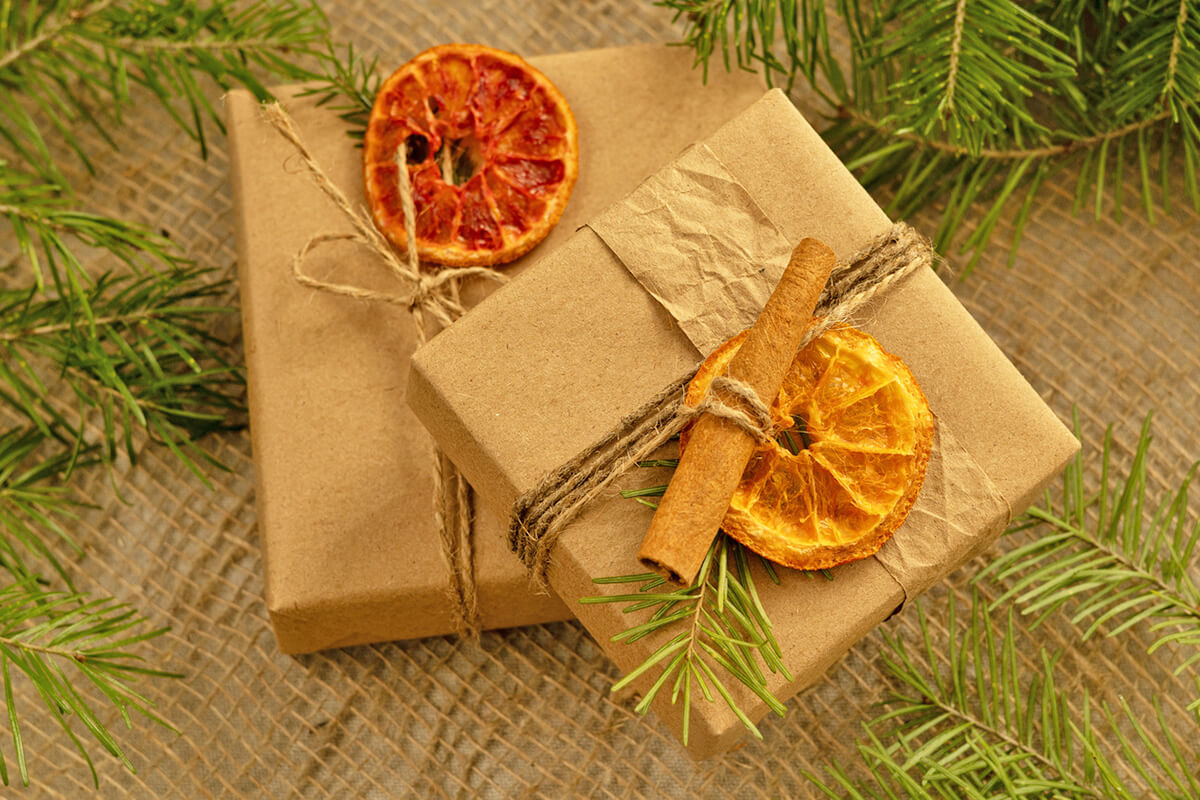 Many mass-produced bows and ribbons are made with nonrecyclable materials such as glue, polyester, and nylon. Opt for versions made from natural fibers such as cotton or raffia that can be reused year after year. You could also adorn your gifts with festive natural elements such as pine springs, dried oranges, or cinnamon sticks to help them stand out from the bunch.