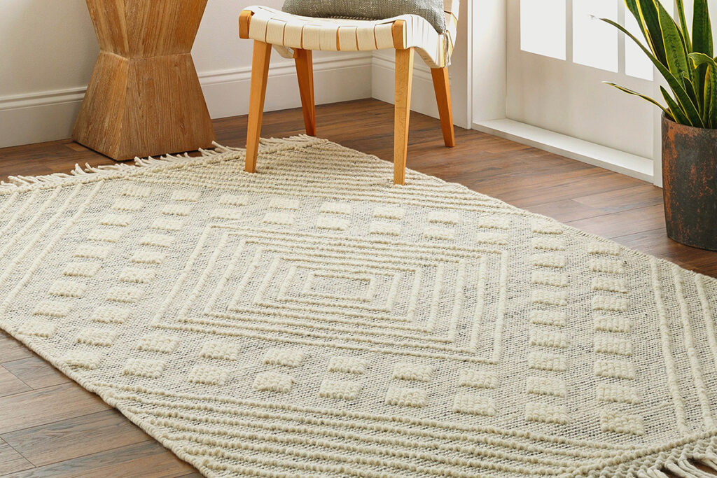 Choosing the right rug size is tricky. Anything too big or too small will throw off the proportions of the room. Shop for one large enough to touch all of the furniture in the area you’re trying to define. At minimum, the front two legs of each furniture piece should rest on the rug.